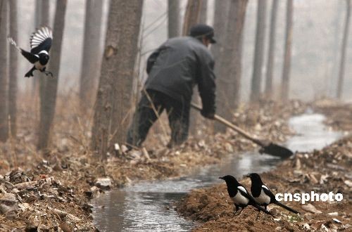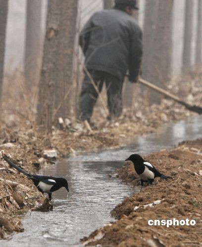 2月6日,河南洛陽嵩田湖鎮(zhèn)農民引來嵩伊渠水流灌溉干旱的油菜地,一些喜鵲也趁機追逐水流,嬉戲解渴。中新社發(fā) 張曉理 攝