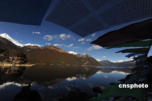 2009年初春,西藏林芝巴松措湖,經(jīng)幡在湖邊飄舞,人文景觀和雪山圣湖自然景觀圣潔迷人。通過冬季旅游促銷活動,西藏旅游業(yè)呈現(xiàn)回暖趨勢,農(nóng)歷春節(jié)期間,西藏旅游業(yè)的各項(xiàng)指標(biāo)開始增長,業(yè)內(nèi)人士認(rèn)為,即將到來的藏歷新年將更快提升西藏旅游熱度。中新社發(fā) 廖攀 攝