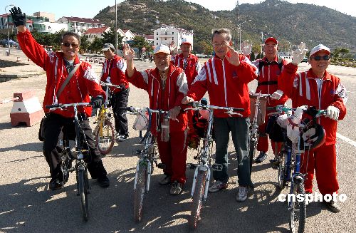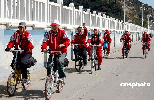10月20日,由上海市老體協(xié)章向東等七位老人自發(fā)組成的“暢游蘇北迎奧運”自行車騎游隊來到連云港。他們10月18日從徐州騎自行車出發(fā),終點為上海,途經(jīng)連云港、淮安、揚州、泰州,計劃用15天時間到達(dá)目的地。騎游隊中年齡最大者80歲,最小的也70歲。老人們通過這種形式,既鍛煉身體暢游名勝,又是喜迎奧運的一次有意義的活動。中新社發(fā) 王春 攝
