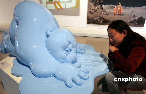 正在上海舉行的動(dòng)漫美學(xué)雙年展有許多作品趣味逗人,一名觀眾在《睡著了》作品旁做模仿?tīng)睢?jù)悉,參展的近百件作品來(lái)自意大利、美國(guó)、中國(guó)大陸和臺(tái)灣地區(qū)。中新社發(fā) 潘索菲 攝