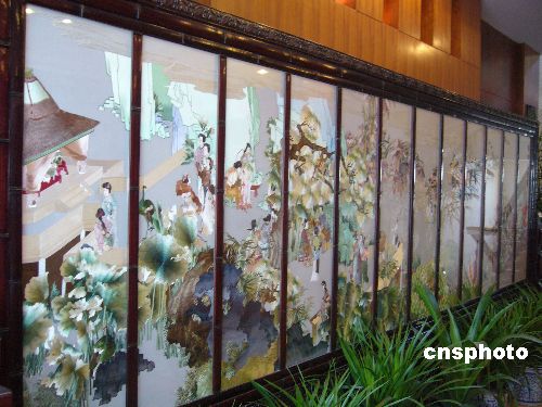 11月2日,巨型蘇繡《群仙祝壽圖》。近日,一幅長12米、寬5米的巨型蘇繡《群仙祝壽圖》亮相江蘇蘇州一家商場,該作品由12位繡娘花費(fèi)近半年時(shí)間繡制完成,標(biāo)價(jià)98萬元人民幣。中新社發(fā) 李俊鋒 攝