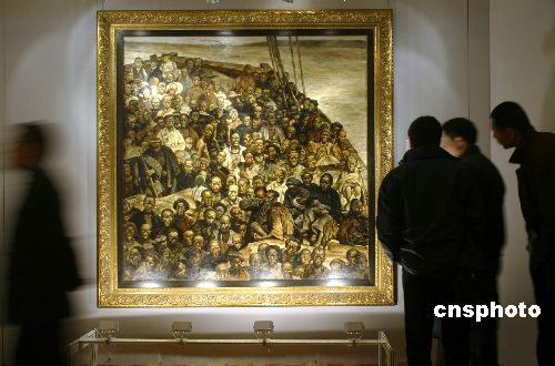 十一月四日,在嘉德2007秋季拍賣會預展上,觀眾正在觀摩中國畫家程叢林的油畫《華工船》。該作品以十九世紀華工背井離鄉(xiāng)、漂洋過海的血淚史為題材,是程叢林的代表作之一。該作品將于11月6日被拍賣,該作品估價超過2000萬元人民幣。中新社發(fā) 張煒 攝