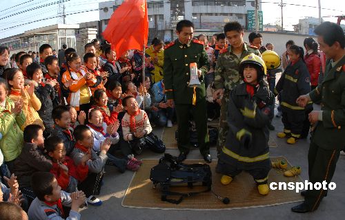 11月5日,小學(xué)生在消防戰(zhàn)士的幫助下試穿消防服,零距離接觸消防裝備。當(dāng)日,山東省棗莊市臺兒莊區(qū)消防大隊(duì)舉辦“消防開放日”活動(dòng),1000余名中小學(xué)生走進(jìn)消防大隊(duì)與消防裝備零距離接觸,消防隊(duì)員還將對中小學(xué)生進(jìn)行消防演示、講解消防法規(guī)、消防常識及火災(zāi)撲救方法等消防安全知識。中新社發(fā) 高啟民 攝