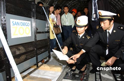 第一只在國外自然交配出生的大熊貓“美生”11月6日晚由美國飛抵上海浦東機(jī)場!懊郎钡竭_(dá)后,即被送往上海野生動物園。這是上海海關(guān)第一次監(jiān)管過境的大熊貓,所以海關(guān)人員一直陪伴在“美生”身邊。11月7日,“美生”將回到其父母的出生地——四川臥龍定居。中新社發(fā) 殷琮 攝