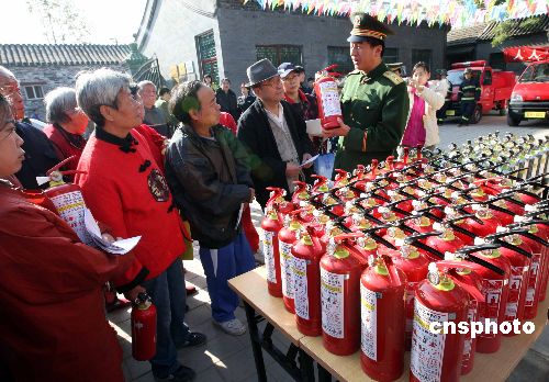 十一月八日,“11.9”消防宣傳日前夕,北京西城消防官兵來到屬地的社區(qū),為民眾發(fā)放滅火器并現(xiàn)場演示滅火器的使用方法,宣傳家庭中火災的撲救等常識,提高市民的防范意識。中新社發(fā) 任海霞 攝