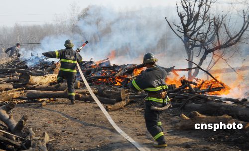 2007年11月10日,位于山西省盂縣一家廢舊木材回收站突然發(fā)生火災(zāi),盂縣消防大隊(duì)接警后迅速趕赴現(xiàn)場撲救,經(jīng)過近1個多小時的緊急撲救,終于將大火撲滅。火災(zāi)未造成人員傷亡,并成功防止了火勢向周圍民房和森林的蔓延。目前,火災(zāi)原因和損失正在調(diào)查之中。中新社發(fā) 程瑜 攝
