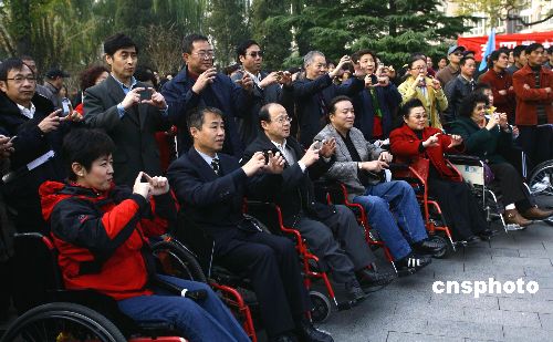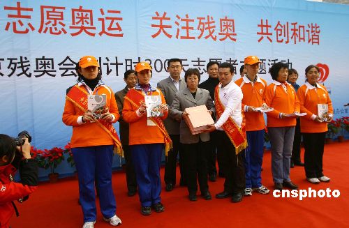 11月11日,主題為“微笑北京、志愿奧運(yùn)、關(guān)注殘奧、共創(chuàng)和諧”的2008北京殘奧會(huì)倒計(jì)時(shí)300天志愿者主題活動(dòng),在北京東四奧林匹克社區(qū)公園舉行,《北京殘奧會(huì)志愿者培訓(xùn)教材》中文版和盲文版首發(fā),同時(shí)為第二批奧運(yùn)會(huì)、殘奧會(huì)志愿者培訓(xùn)基地授牌。中新社發(fā) 杜洋 攝
