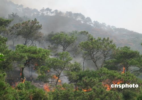 十一月十一日零晨廣東鼎湖富廊村的北嶺山林場(chǎng)布基工區(qū)發(fā)生山火,到十二日記者發(fā)稿時(shí)止,總過火面積約四千畝,現(xiàn)場(chǎng)東線桃園工區(qū)火勢(shì)得到較好控制,但山火仍在全力撲救中,當(dāng)?shù)匾颜{(diào)集二千五百人次撲救,并出動(dòng)兩架直升飛機(jī)從空中灑水彈滅火,暫未收到人員傷亡的報(bào)告。中新社發(fā) 黃耀輝 攝