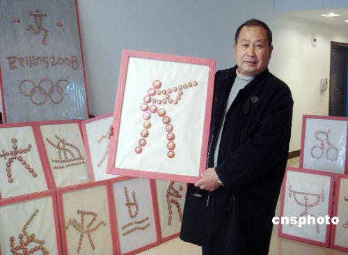 11月20日,62歲重慶市市民黃均德展示他用1860枚毛澤東像章拼成的一整套奧運(yùn)標(biāo)志圖案。圖標(biāo)包括35個(gè)奧運(yùn)運(yùn)動(dòng)項(xiàng)目和一個(gè)五環(huán)標(biāo)志,共計(jì)36幅。中新社發(fā) 李林峰 攝