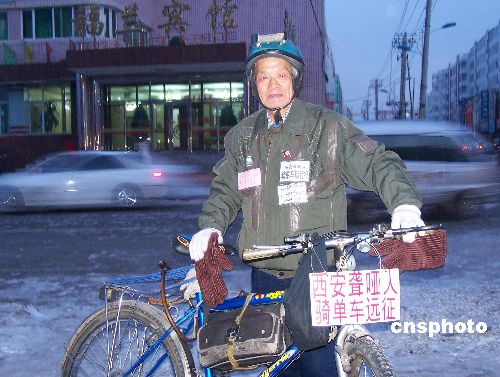 11月28日,來自陜西西安的一位頭發(fā)花白、精神矍鑠的聾啞老人唐應(yīng)成騎著單車抵達(dá)黑河市福蘭賓館附近。為了完成自己“走遍全中國,宣傳2008年北京奧運(yùn)會,成為全國聾啞第一人”的夢想,從1997年4月5日開始,在家人的全力支持下,62歲的西安聾啞老人唐應(yīng)成騎單車,先后沿四川、云南、湖北、湖南、廣東、海南、廣西、新疆、山西、內(nèi)蒙古一路走了下來,經(jīng)過長達(dá)十年零三個月的艱苦跋涉,已經(jīng)走過了全國27個省、市、自治區(qū),行程42萬多公里,以自己獨(dú)特的方式,表達(dá)了一個普通公民對北京2008年奧運(yùn)會的支持。經(jīng)過與老人用紙和筆的采訪和溝通,老人從隨行的包裹中拿出許多各地對他的相關(guān)報道。唐應(yīng)成每到一地,除了收集當(dāng)?shù)厝罕婈P(guān)于申辦奧運(yùn)的祝福語、宣傳畫外,還用隨身攜帶的照相機(jī),拍下所到之處的風(fēng)土人情和自然風(fēng)光,匯集成簡單的畫冊,作為遠(yuǎn)征的見證。