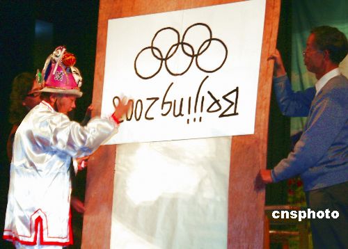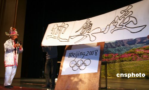 11月29日,遼寧沈陽鄭錫平在八一劇場北方老齡藝術(shù)團(tuán)5周年年慶會上,用自制的自來水毛筆表演“倒著一筆”分別寫完“2008北京奧運(yùn)”、“五環(huán)”、“迎奧運(yùn)”等,得到與會人員的贊嘆。