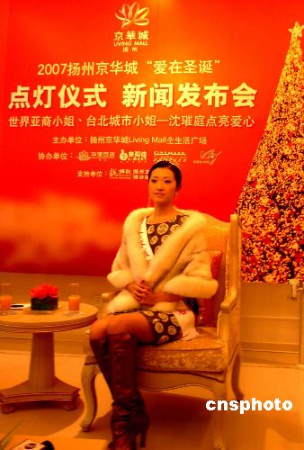 11月30日,揚(yáng)州舉辦“愛(ài)在圣誕”點(diǎn)燈儀式及中國(guó)麥田計(jì)劃獻(xiàn)愛(ài)心新聞發(fā)布會(huì)。世界亞裔小姐、臺(tái)北城市小姐沈璀庭出席,并將于12月1日晚在揚(yáng)州京華城廣場(chǎng)為21米高的巨型圣誕樹(shù)啟動(dòng)“愛(ài)在圣誕”點(diǎn)燈儀式,并與“中國(guó)麥田計(jì)劃”愛(ài)心慈善團(tuán)體攜手獻(xiàn)愛(ài)心。“中國(guó)麥田計(jì)劃”于2005年成立,是一個(gè)為貧困地區(qū)兒童建立圖書室、捐贈(zèng)衣物及創(chuàng)造讀書機(jī)會(huì)的民間志愿組織。中新社發(fā) 崔佳明 攝