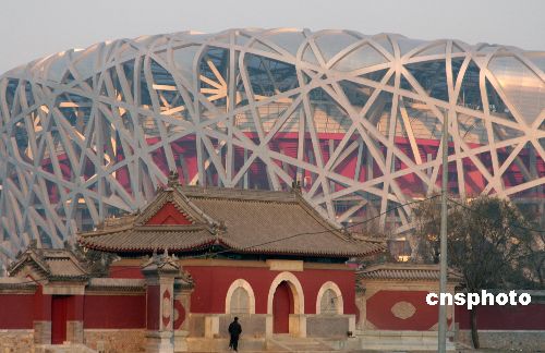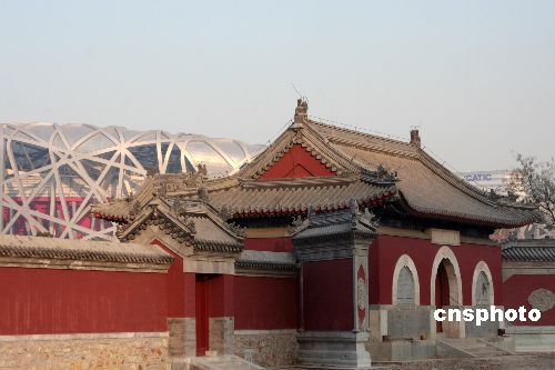12月4日,北京奧運會主會場“鳥巢”、國家游泳中心“水立方”與附近的中國古代建筑相映成趣,宏偉的國家體育場和明代的娘娘廟讓現(xiàn)代與傳統(tǒng)完美結合。中新社發(fā) 吳芒子 攝