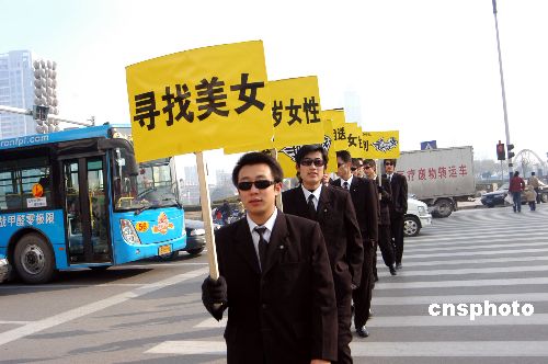 12月4日,在山東濰坊勝利街一繁華路段,八名身穿西裝、戴著墨鏡的“酷男”舉著“尋找美女”的牌子,招來不少路人的目光。據(jù)悉,這是某商場的另類促銷。中新社發(fā) 王志德 攝