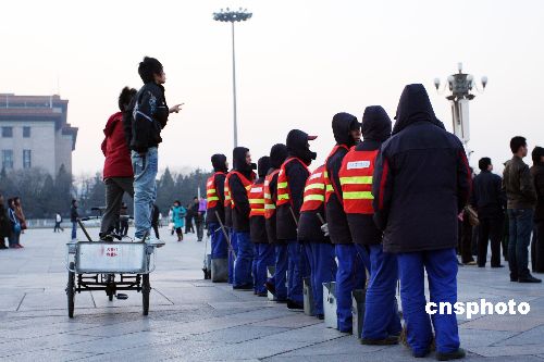 12月7日,在北京天安門廣場,一批環(huán)衛(wèi)工人集體列隊(duì)觀看降旗儀式。北京氣溫已近零攝氏度,但人們觀看的熱情仍然不減。中新社發(fā) 鄭雄增 攝