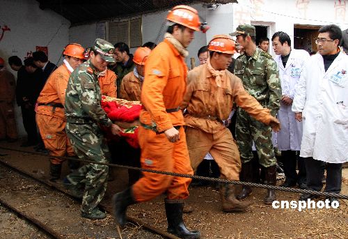 十二月十六日十三時五分,在地下被困一百一十四個小時后,安徽繁昌鐵礦事故六名受困礦工被成功救出。獲救的六名礦工被抬出礦井后,立即被等候在現(xiàn)場的救護(hù)車送到醫(yī)院急救中心,現(xiàn)在尚不能確定被救礦工是否脫離生命危險(xiǎn)。目前還有一人下落不明,搜救工作仍在進(jìn)行。中新社發(fā) 水從澤 攝