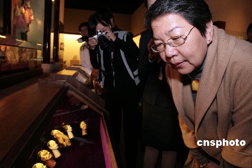 十二月二十三日,臺(tái)灣著名女詩人、散文家、畫家席慕容來到福建泉州中國閩臺(tái)緣博物館參觀,當(dāng)她看到兩岸傳統(tǒng)習(xí)俗和傳統(tǒng)技藝展示時(shí)大為感動(dòng),像回到了童年時(shí)代。圖為席慕容在木偶頭像前駐足了許久。中新社發(fā) 傅丹丹 攝