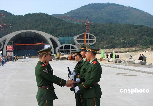 十二月二十四日,“南海一號(hào)”靠近碼頭等待漲潮后登陸,中國(guó)海事巡邏船、公安邊防艇在海上層層保衛(wèi),同時(shí),警戒線已經(jīng)在岸上的博物館兩翼撒開(kāi),嚴(yán)禁無(wú)關(guān)人員進(jìn)入。圖為在海上絲綢之路博物館前執(zhí)勤的武警。中新社發(fā) 索有為 攝