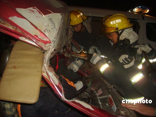 12月24日,山東棗莊發(fā)生一起兩車追尾事故。當(dāng)?shù)叵乐ш?duì)特勤中隊(duì)接到報(bào)警后,派出12名消防官兵、一輛搶險(xiǎn)救援車和一輛水罐車。經(jīng)過(guò)近半個(gè)小時(shí)施救,2名被困人員成功獲救。中新社發(fā) 季龍 攝
