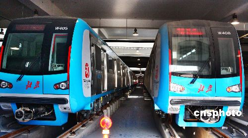 1月2日,北京地鐵10號線萬柳車輛段,工作人員對首批地鐵車輛進行檢測調(diào)試工作。據(jù)悉,北京地鐵10號線一期(含奧運支線)全線軌道具備行車條件后,首批車輛和地鐵運營公司已進駐該車輛段,今年2月將開始空載試運行,6月載客試運行。首批車輛的車頭為藍色,并刷有紅色的中國印標識,車體為不銹鋼本色,車內(nèi)白色座椅、紅色扶手和拉環(huán),車門有扶手。中新社發(fā) 鄭雄增 攝