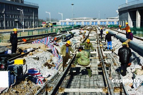 北京地鐵10號線萬柳車輛段,工作人員在加緊軌道工程建設,并對首批車輛進行檢測調(diào)試工作。