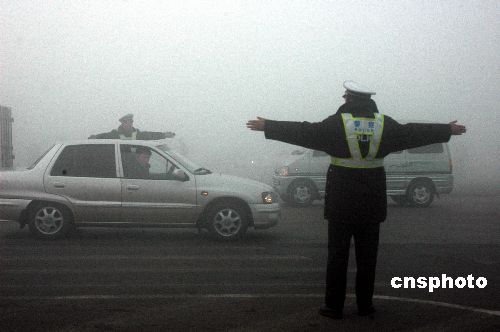 2008年1月7日,一場大霧降臨港城日照,許多路段能見度僅達(dá)三至五米。日照市交警直屬大隊(duì)啟動(dòng)惡劣天氣緊急預(yù)案,在地勢低洼、靠近河道等重點(diǎn)路段部署大量警力,并啟用聲光等多媒體設(shè)備,疏導(dǎo)車輛和人流,確保交通安全。中新社發(fā) 揚(yáng)文 攝