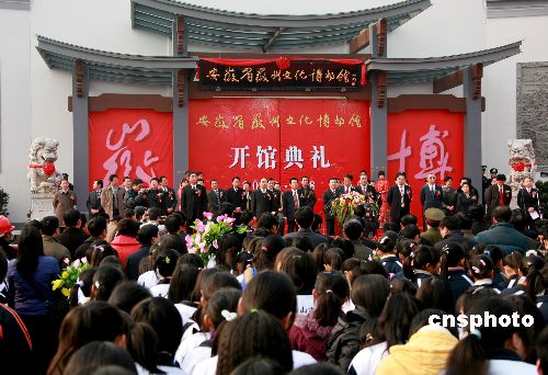 2008年1月8日,安徽徽州文化博物館落成開館。該館館藏的近10萬件(冊(cè))歷史藏品全面、系統(tǒng)、完整地展示了徽州文化。博物館坐落在黃山市,占地157畝,建筑面積14000平方米,總投資7000萬元,是集徽州文化展示、收藏、研究、培訓(xùn)、非物質(zhì)文化遺產(chǎn)演繹、交流旅游觀光為一體的國(guó)家大型地方綜合性博物館。徽州文化博物館是以徽州文化為基本內(nèi)容、徽州地理山水為背景、徽派建筑風(fēng)格為基調(diào)的一組多功能徽派風(fēng)景園林建筑,由陳列區(qū)、收藏區(qū)、文化產(chǎn)業(yè)區(qū)等組成。中新社發(fā) 方也廣德 攝