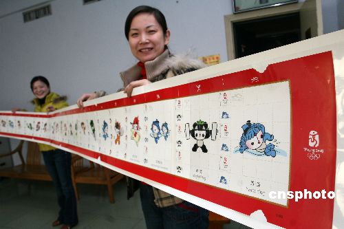 1月8日,河南省許昌市郵政局集郵公司的工作人員在展示《奧運大長卷》。《奧運大長卷》巨幅郵票是北京奧組委破例審批的超大規(guī)模奧運珍品郵票,總長達到6.33米。該郵票包含了北京奧運會會徽、吉祥物、38個運動分項造型和北京奧運口號等,有128枚連接在一起,單個項目福娃的規(guī)格是普通郵票的25倍,是史上規(guī)模最大和奧運郵票最全的北京奧運特種郵票長卷。據(jù)悉,6.33米長的《奧運大長卷》郵票比以往我國發(fā)行的《清明上河圖》郵票長卷還要長上1米多,其長度和包含的郵票內(nèi)容都創(chuàng)造了奧運郵票發(fā)行的新紀錄。中新社發(fā) 牛書培 攝