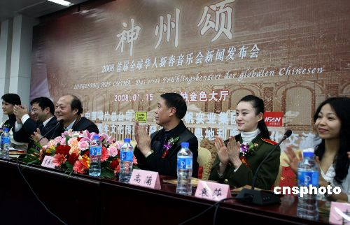 1月8日,“神州頌2008·首屆全球華人新春音樂(lè)會(huì)”新聞發(fā)布會(huì)在北京舉行。由中央電視臺(tái)、中國(guó)唱片總公司、重慶力帆集團(tuán)共同打造的“神州頌2008·首屆全球華人新春音樂(lè)會(huì)”,將于1月15日在奧地利維也納金色大廳拉開(kāi)帷幕,國(guó)際著名指揮家邵恩擔(dān)任指揮。在世界音樂(lè)之都的神圣殿堂,“神州頌2008·首屆全球華人新春音樂(lè)會(huì)”的舉行將是一場(chǎng)極富東方魅力的視聽(tīng)盛宴。中新社發(fā) 張勤 攝