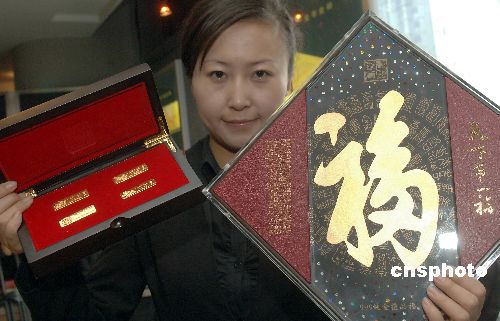 1月8日,由國道黃金發(fā)行的“中國純金壓歲錢”(禮盒)、 “中國春節(jié)金條”、“純金天下第一福”等貴金屬產(chǎn)品在北京上市。“中國春節(jié)金條”是一款春節(jié)氣息濃郁的賀歲產(chǎn)品,包含4根20克的金條,以最具春節(jié)代表性的餃子、爆竹、年畫、湯圓為主圖案,傳達(dá)這些春節(jié)元素的由來、歷史故事!凹兘鹛煜碌谝桓!币郧宄滴趸实塾诠1673年為祖母孝莊太后“請福續(xù)壽”而書寫的“!弊(被稱為“天下第一!)為主題,以純金為材質(zhì)。中新社發(fā) 鄒憲 攝
