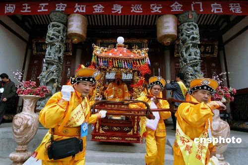 一月八日,福州市晉安閩臺王審知研究會在福州蓮花山閩王紀念館舉行儀式,歡送閩王金身首次巡安金門。九日上午,閩王金身將經(jīng)廈金航線直航金門,進行為期四天的巡安活動。中新社發(fā) 王東明 攝