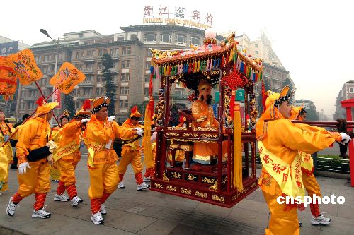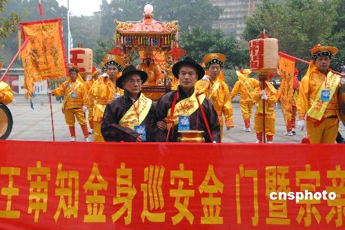 一月九日上午,閩王王審知金身在七十余位福州王氏宗親文化交流訪問團(tuán)成員護(hù)送下,在廈門上船經(jīng)“廈金”航線直航金門巡安,進(jìn)行為期四天的交流活動(dòng)。這是閩王金身首次赴金門巡安,期間福州與金門兩地王氏宗親將共同進(jìn)行祭祖、學(xué)術(shù)交流等活動(dòng)。中新社發(fā) 王東明 攝