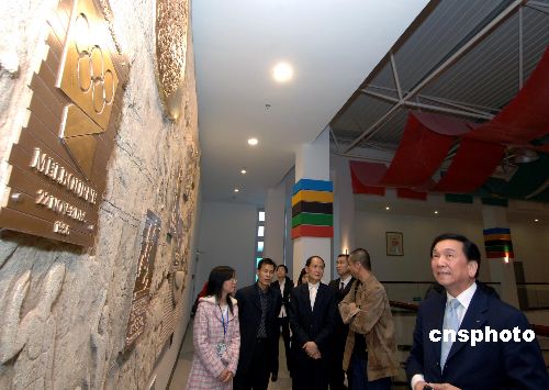 中國(guó)臺(tái)北國(guó)際奧委會(huì)委員吳經(jīng)國(guó)先生(右一),在廈門奧林匹克博物館向來賓介紹歷屆夏季奧運(yùn)會(huì)海報(bào)浮雕墻。