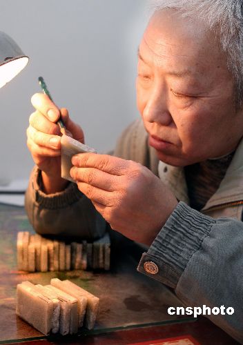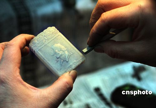 1月11日,北京玉器廠工藝師正在加工2008套12生肖玉牌。這2008套12生肖玉牌為中國國際藝術(shù)聯(lián)盟制作,作為奧運(yùn)收藏紀(jì)念品將在北京2008年奧運(yùn)會前完成上市。其圖案由李燕、金鴻鈞等12位中國當(dāng)代著名畫家創(chuàng)作。中新社發(fā) 宋吉河 攝