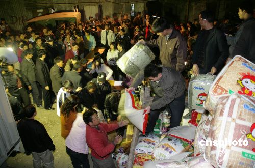 圖為一月十四日晚,惠州市為災(zāi)民發(fā)放慰問(wèn)品現(xiàn)場(chǎng)。一月十三日上午,在廣東惠州市區(qū)河南岸街道辦事處河南岸村渡船頭村民小組面積過(guò)萬(wàn)平方米的一片棚屋發(fā)生火災(zāi),造成三百多名來(lái)自河南、安徽等地的種菜和收廢品的外來(lái)民工受災(zāi);馂(zāi)發(fā)生后,惠州市委、市政府和惠城區(qū)委、區(qū)政府以及河南岸辦事處立即妥善安置了災(zāi)民的生活。中新社發(fā) 宋秀杰 攝