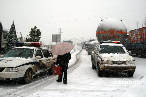 1月15日,贛北遭遇10年一遇的暴雪天氣,江西九江市及8個縣(市)發(fā)布暴雪藍色預(yù)警及道路結(jié)冰黃色預(yù)警信號,因路面結(jié)冰,九江長江大橋、鄱陽湖大橋及所有高速公路全部封閉,交通安全及通行受到嚴重影響。中新社發(fā) 張 俊 攝
