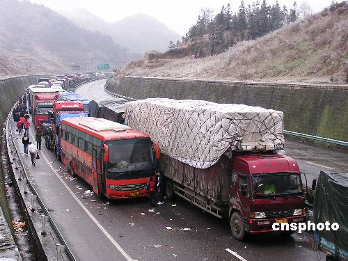 圖為高速公路上車輛排成長龍。從1月14日受冷空氣影響,貴州福泉市溫度一直下降在-1℃—2℃,夜間下雨雪,造成公路面上結(jié)冰凍。福泉市公安交警大隊(duì)為確保過往客運(yùn)、貨運(yùn)車輛安全,1月18日下午16時(shí)對(duì)貴新高速公路馬場(chǎng)坪站、馬(馬場(chǎng)坪)至遵(遵義)公路進(jìn)行封鎖,全隊(duì)民警24小時(shí)值班守護(hù)。中新社發(fā) 易勝武 攝