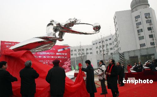 1月19日,中國(guó)科學(xué)院辦公廳、中國(guó)國(guó)家博物館、國(guó)家天文臺(tái)在北京中國(guó)科學(xué)院奧運(yùn)村科技園聯(lián)合舉行大型雕塑作品“嫦娥奔月”落成揭幕儀式,同時(shí)舉行該作品由中國(guó)國(guó)家博物館永久收藏儀式。雕塑“嫦娥奔月”由中國(guó)著名雕塑藝術(shù)家遙遠(yuǎn)先生創(chuàng)作完成,聯(lián)手四川舍得酒業(yè)集團(tuán)贈(zèng)送中國(guó)科學(xué)院。中新社發(fā) 錢興強(qiáng) 攝