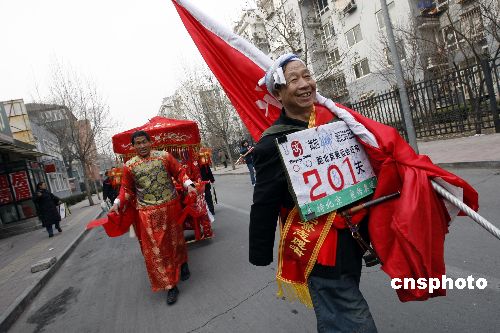 1月20日,山西“驢驢人”倪育生和來自山東的大花轎一起闖進了北京東四奧林匹克社區(qū),為迎接北京奧運會倒計時200天做宣傳。當(dāng)日,來自全國7省市的民間奧運宣傳志愿者齊聚北京,相互交流奧運宣傳經(jīng)驗。中新社發(fā) 杜洋 攝