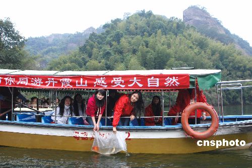 一月二十四日,新膺世界小姐中國姑娘張梓琳在世界地質(zhì)公園廣東丹霞山翔龍湖放生鯉魚。是日,張梓琳在丹霞山踐行她任期內(nèi)的環(huán)保宣傳。中新社發(fā) 馮昶 攝