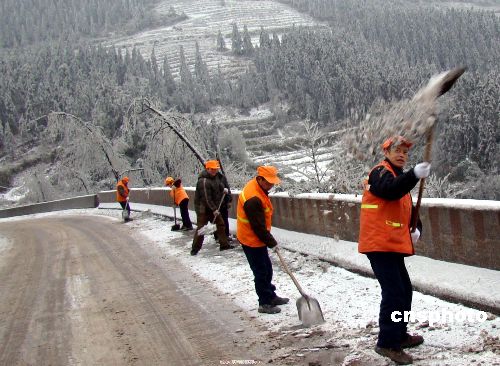 1月24日,四川瀘州敘永道班工人正在321國(guó)道上清掃積雪,確保道路暢通。受冷空氣影響,該縣南面鄉(xiāng)鎮(zhèn)普遍遭受15年不遇的冰雪災(zāi)害襲擊,全縣12個(gè)鄉(xiāng)鎮(zhèn)、25萬(wàn)人受災(zāi)。該縣境內(nèi)321國(guó)道等4條國(guó)、省道共59公里路段因路面結(jié)冰而封閉,11個(gè)鄉(xiāng)鎮(zhèn)因冰雪壓斷電線(xiàn)、電桿而停電。災(zāi)情發(fā)生后,該縣成立指揮部組織抗災(zāi)救災(zāi)工作。據(jù)氣象部門(mén)預(yù)測(cè),冰雪低溫天氣還將持續(xù)一周左右,災(zāi)情仍在持續(xù)。中新社發(fā) 黃虎 攝