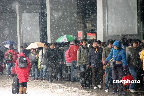 2008年1月26日,南京出現(xiàn)入冬以來最大幅度的降溫和雨雪天氣,受通往外地的高速公路全部關(guān)閉的影響,南京火車站迎來春運(yùn)以來的最大客流量,前來購票的旅客一直排到站外廣場,交警和武警官兵也協(xié)助車站方面維護(hù)秩序。中新社發(fā) 阿董 攝