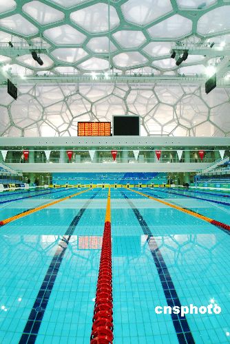 1月26日,北京奧林匹克公園內(nèi)的北京奧運(yùn)會游泳館“水立方”,進(jìn)行各項設(shè)施調(diào)試,以迎接1月31日在這里舉行的“好運(yùn)北京”中國游泳公開賽測試賽。中新社發(fā) 富田 攝