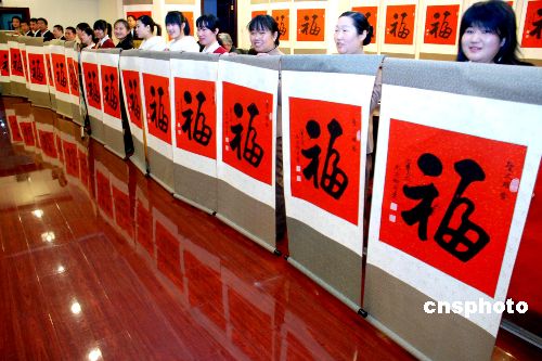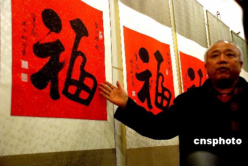 1月27日,唐代著名書法家柳公權(quán)的后裔柳國慶正在介紹為圣火傳遞城市贈“!钡囊饬x。這些裝裱好的福字是中國著名書法家柳國慶書寫的。近日,將通過特快專遞在把福字贈送到全球奧運圣火即將傳遞的130多個城市的電視臺,并通過電視傳播將這種中國特有的藝術(shù)形式為08北京奧運圣火成功傳遞祈福。中新社發(fā) 楊慧峰 攝