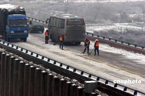 1月28日,工人們正在107國道湖南水渡河大橋上緊張除冰,車輛從他們身邊緩慢駛過。根據(jù)最新氣象資料分析,本周湖南將繼續(xù)維持雨雪、冰凍、嚴(yán)寒天氣,局部地區(qū)有大到暴雪?篂(zāi)形勢依然十分嚴(yán)峻。中新社發(fā) 白祖偕 攝