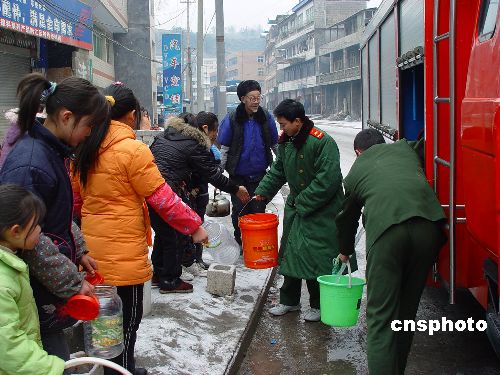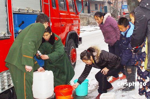 1月28日,重慶黔江消防官兵為自來水中斷近一周的交通西路居民送水到戶。連日來,重慶市近10個區(qū)縣普降大雪,部分地區(qū)積雪最深度甚至超過20厘米,由于大雪覆蓋,天氣寒冷,一時間,黔江、武隆、酉陽、彭水等區(qū)縣均出現(xiàn)公路結(jié)冰、電力中斷、市民飲水困難情況,對群眾生活造成極大困繞。中新社發(fā) 王松 攝