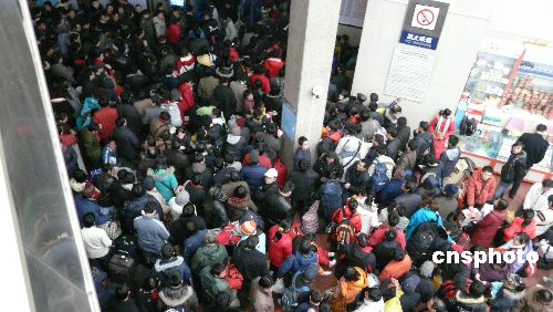 1月27日18點(diǎn) 、28日6點(diǎn)安徽省合肥市兩次發(fā)布暴雪紅色警報(bào)。1月28日,在合肥火車站廣場(chǎng)上,上萬(wàn)名旅客在暴雪中排隊(duì)購(gòu)票。合肥汽車客運(yùn)全線停運(yùn),鐵路客運(yùn)乘客猛增。暴雪同樣導(dǎo)致了多趟列車晚點(diǎn),火車站站臺(tái)上、大廳內(nèi)擠滿了急于返鄉(xiāng)的民工。由于鐵路部門(mén)也無(wú)法確定火車進(jìn)站的具體時(shí)間。部分旅客在站臺(tái)吃方便面充饑御寒,等待列車的到來(lái)。目前合肥火車站正全力疏導(dǎo),安撫旅客。中新社發(fā) 成展鵬 李君 攝
