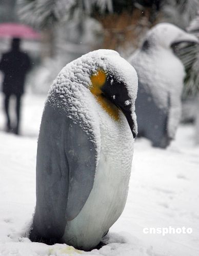 圖:“南極企鵝”在上海街頭享受漫天飛雪