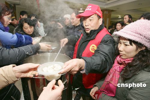 近期由于受大雪天氣影響導(dǎo)致國內(nèi)大范圍的鐵路、公路交通受阻或中斷,使大批返鄉(xiāng)旅客滯留杭州火車站、杭州火車東站和市區(qū)各大長途汽車站,從1月27日起,杭州市開辟了部分劇院、大廈、會展中心、體育館等公共場所及搭建軍用帳篷等作為滯留旅客的臨時駐留點。至1月30日下午,已先后接待了近10萬人次的滯留旅客,當(dāng)?shù)氐恼块T、企事業(yè)單位、部隊、公安、街道、衛(wèi)生、共青團(tuán)、市民志愿者等紛紛行動起來,按照“有水喝、有飯吃、有地方安頓、生病有醫(yī)治、困難群眾有救助”的要求,以各種形式盡力為所有滯留旅客提供生活保障和溫馨服務(wù)。 中新社發(fā) 李忠 攝