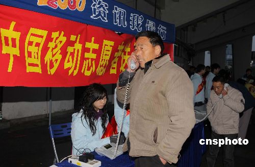 近期受連續(xù)雨雪和凍雨天氣影響,大批旅客滯留廣州及韶關(guān)等地。廣州移動啟動現(xiàn)場應(yīng)急通信保障,向滯留旅客提供免費(fèi)電話服務(wù),向家人報平安。同時發(fā)送定向短信,第一時間通報春運(yùn)動態(tài)。中新社發(fā) 譚穎 攝